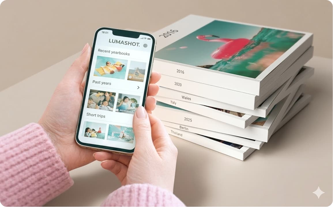 Lumashot scans your library and creates photobooks from recent years instantly. Free to browse. No setup. Processed on your device. Your photos stay private. No drafts. No approvals. No waiting for you to get around to it. Edit if you want - not because you have to.